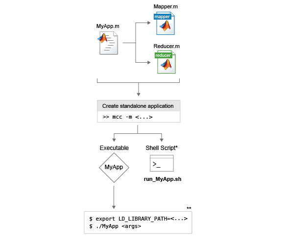 Напишите сценарий приложения MATLAB или функцию, которая вызывает функции mapper и reducer. При написании приложений предпочтительно структурировать их как функции MATLAB по сценариям, поскольку функции принимают входные данные. Конечные пользователи могут использовать это и передавать входные данные, такие как местоположение данных, в приложение.