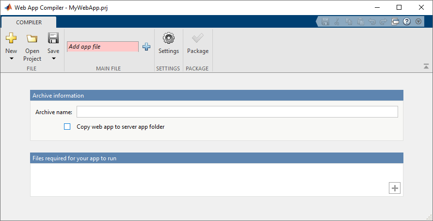 Добавьте вспомогательные файлы, если таковые имеются, в раздел Файлы, необходимые для запуска приложения. К поддерживающим файлам относятся любые MAT-файлы, изображения, используемые веб-приложением, или написанные пользователем функции MATLAB, не найденные MATLAB Compiler™.