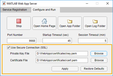 Установите флажок Использовать безопасное подключение (SSL) на сервере веб-приложений MATLAB.