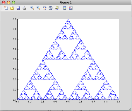 function [x, y] = sierpinski(iterations, draw) % SIERPINSKI Calculate (optionally draw) the points % in Sierpinski's triangle % Copyright 2004 The MathWorks, Inc. % Three points defining a nice wide triangle points = [0.5 0.9 ; 0.1 0.1 ; 0.9 0.1]; % Select an initial point current = rand(1, 2); % Create a figure window if (draw == true) f = figure; hold on; end % Pre-allocate space for the results, to improve performance x = zeros(1,iterations); y = zeros(1,iterations); % Iterate for i = 1:iterations % Select point at random index = floor(rand * 3) + 1; % Calculate midpoint between current point and random point current(1) = (current(1) + points(index, 1)) / 2; current(2) = (current(2) + points(index, 2)) / 2; % Plot that point if draw, line(current(1),current(2));, end x(i) = current(1); y(i) = current(2); end if (draw) drawnow; end