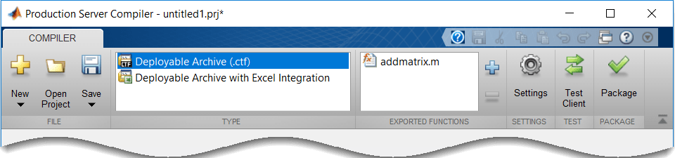 Кроме того, можно открыть приложение компилятора Production Server, введя productionServerCompiler по запросу MATLAB.