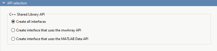 Создание интерфейса, использующего интерфейс MATLAB Data API - создание интерфейса для общей библиотеки с помощью интерфейса MATLAB Data API. Он использует общий интерфейс, имеющий современную семантику C++. Интерфейс поддерживает функциональность C++ 11. Дополнительные сведения см. в разделах Создание общей библиотеки C++ MATLAB Data API и создание приложения C++ .