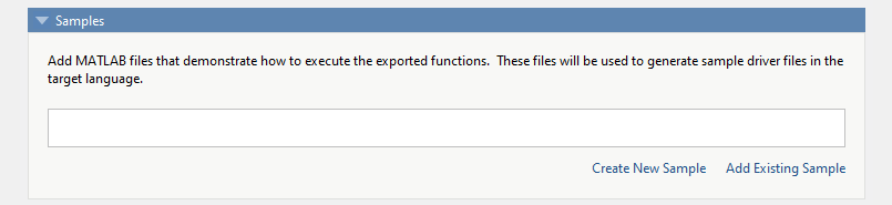 Чтобы загрузить уже написанный файл MATLAB, щелкните Добавить существующий образец. Код MATLAB должен продемонстрировать, как выполнять экспортированные функции. Требуемый код MATLAB может состоять только из нескольких строк: