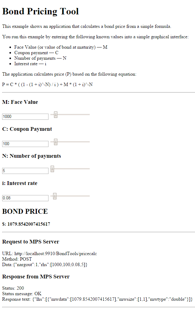 This example shows an application that calculates a bond price from a simple formula.<p>