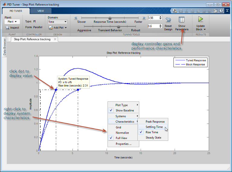Если реакция первоначальной конструкции контроллера не соответствует вашим требованиям, можно в интерактивном режиме скорректировать конструкцию. PID-тюнер предоставляет два параметра домена для уточнения конструкции контроллера: