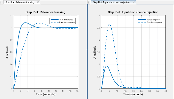 В обоих режимах существует компромисс между эталонным отслеживанием и характеристикой отклонения возмущений. Пример, показывающий, как использовать ползунки для настройки этого компромисса, см. в разделе Настройка контроллера PID на отслеживание ссылок или отклонение нарушений (PID-тюнер).