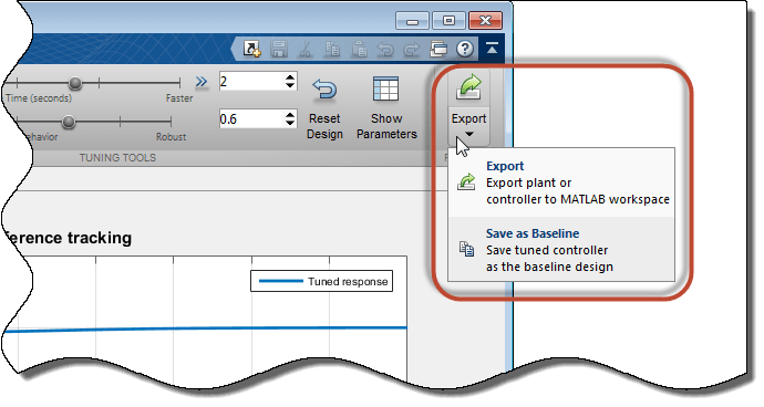 Сделать текущую конструкцию PID-тюнера контроллером базовой линии в любое время, щелкнув стрелку «Экспорт