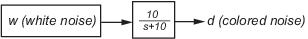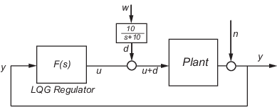 Цель состоит в том, чтобы регулировать производительность установки y около нуля. Входное возмущение d является низкочастотным со спектральной плотностью мощности (PSD), сконцентрированной ниже 10 рад/с. Для целей проектирования LQG он моделируется как белый шум, возбуждающий фильтр нижних частот с отсечкой 10 рад/с, как показано на следующем рисунке.