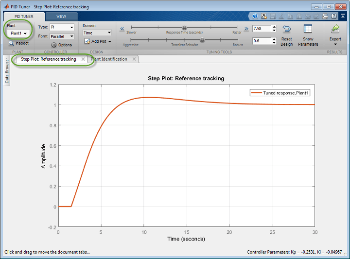 (Apply). Это позволяет сохранить расчетный завод, Plant1, в рабочее пространство тюнера PID. PID-тюнер автоматически проектирует PI-контроллер для Plant1 и на графике Step Plot: Reference Tracking отображается новый отклик с замкнутым контуром. Меню Plant отражает, что Plant1 выбирается для текущей конструкции контроллера.