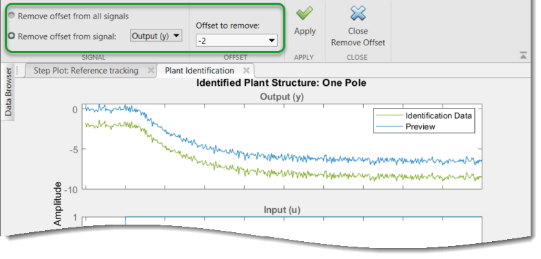 В зависимости от качества и особенностей данных ответа может потребоваться выполнить предварительную обработку данных для улучшения расчетных результатов завода. PID-тюнер предоставляет несколько опций для предварительной обработки данных ответа, таких как удаление смещений, фильтрация или извлечение подмножества данных. В этом примере данные ответа имеют смещение. Для получения хороших результатов идентификации важно удалить смещения данных. Для этого используйте меню Препроцесса. (Сведения о других параметрах предварительной обработки данных см. в разделе Данные предварительной обработки.)