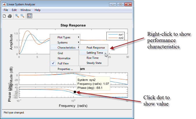 Анализ производительности системы. Например, можно проанализировать пиковый отклик на графике Боде и установить время на графике ответа шага.