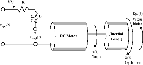 Простая модель двигателя постоянного тока, приводящего в действие инерционную нагрузку, показывает угловую скорость нагрузки, ), в качестве выходного сигнала и приложенного напряжения, качестве входного сигнала. Конечной целью этого примера является управление угловой скоростью путем изменения приложенного напряжения. На этом рисунке показана простая модель двигателя постоянного тока.