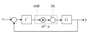 Предположим, что вас интересуют эффекты возмущения, введенного на u в этой системе управления. Вставка AnalysisPoint блок в местоположении u связывает подразумеваемый вход, подразумеваемый выход и опцию размыкания цикла в этом местоположении, как показано на следующей диаграмме.