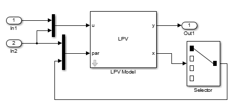Рассмотрим модель LPV с 2 входами и 3 выходами и 4 состояниями. Использовать входные данные u(2) и состояние x(1) в качестве параметров планирования. Настройте модель Simulink, как показано на следующем рисунке.