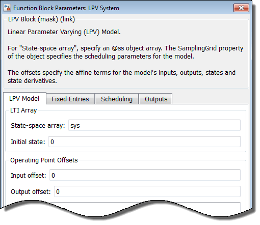 Диалоговое окно «Параметр блока системы LPV» содержит пять вкладок для указания системных данных, алгоритма планирования и выходных портов. В следующей таблице представлены параметры блока.