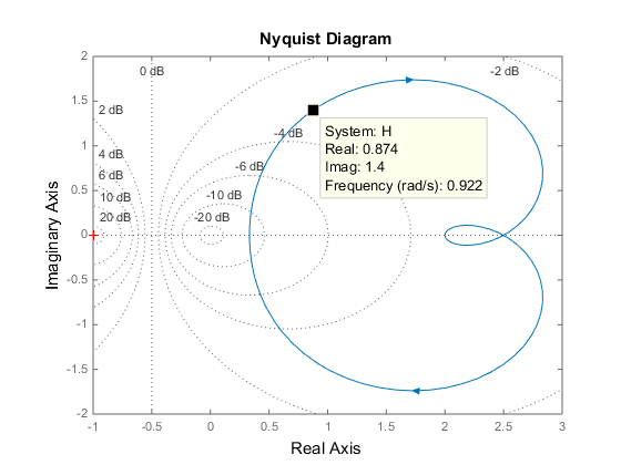 nyquistplot(sys,{wmin,wmax}) рисует график Найквиста для частот между wmin и wmax (в rad/TimeUnit, где TimeUnit - единицы времени входной динамической системы, указанные в TimeUnit имущество sys).