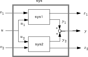 Векторы inp1 и inp2 содержат индексы во входных каналах sys1 и sys2соответственно и определяют входные каналы u1 и u2 на диаграмме. Аналогично, векторы out1 и out2 содержат индексы в выходах этих двух систем и определяют выходные каналы y1 и y2 на диаграмме. Результирующая модель sys имеет [v1; u; v2] в качестве входов и [z1; y; z2] в качестве выходных данных.