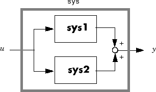 sys = parallel(sys1,sys2) формирует основное параллельное соединение, показанное на следующем рисунке.