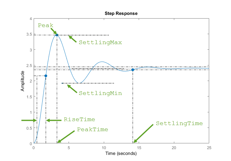 вычисляет характеристики «шаг-ответ» из массива данных «шаг-ответ» S = stepinfo(y,t)y и соответствующий вектор времени t. Для системных ответов SISO, y является вектором с тем же количеством записей, что и t. Для данных ответа MIMO, y - массив, содержащий отклики каждого канала ввода-вывода. Этот синтаксис использует последнее значение в y (или последнее значение в соответствующих ответных данных каждого канала) в качестве установившегося значения для вычислительных характеристик, которые зависят от этого значения.