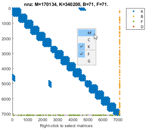 Вы можете использовать spy для визуализации шаблона разреженности mechss объект модели. Можно щелкнуть правой кнопкой мыши на графике, чтобы выбрать матрицы для отображения.