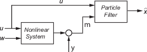 Блок фильтра частиц оценивает состояния дискретно-временной нелинейной системы, используя алгоритм дискретно-временного фильтра частиц.