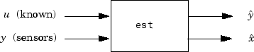 Векторы индекса sensors и known указать, какие выходы sys измеряются (y), и какие входы sys известны (u). Результирующий оценщик est, найденный с использованием следующих уравнений, использует как u, так и y для получения выходных оценок и оценок состояния.