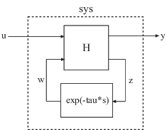 [ разлагает модель состояния-пространства H,tau] = getDelayModel(sys)sys с внутренними задержками в модель без задержки состояния-пространства, Hи вектор внутренних задержек, tau. Взаимосвязь между sys, H, и tau показано на следующей схеме.