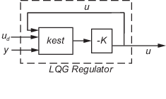 rlqg = lqgreg(kest,k,controls) обрабатывает оценщики, которые имеют доступ к дополнительным детерминированным известным установкам. Вектор индекса controls затем определяет, какие входы оценщика являются управляющими u, и результирующий регулятор LQG rlqg имеет ud и y в качестве входных данных (см. следующий рисунок).