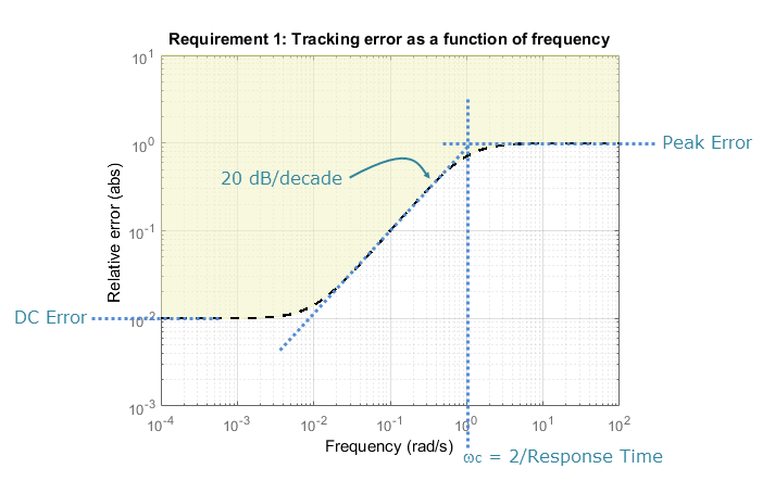 err = frd([0.01 0.01 1],[0 1 100]); Req = TuningGoal.Tracking('theta_ref','theta',err);