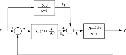 F = 0.3/(s+4); P.InputName = 'u'; P.OutputName = 'y'; C.InputName = 'e'; C.OutputName = 'uc'; F.InputName = 'r'; F.OutputName = 'uf'; Sum1 = sumblk('e','r','y','+-'); % e = r-y Sum2 = sumblk('u','uf','uc','++'); % u = uf+uc Tff = connect(P,C,F,Sum1,Sum2,'r','y');