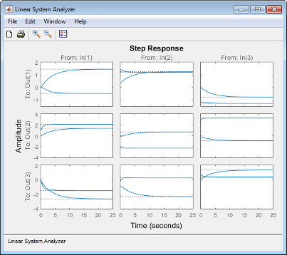 Появляется набор из 9 графиков, по одному от каждого входа к каждому выходу, каждый из которых показывает ступенчатые отклики соответствующих операций ввода-вывода обеих моделей в массиве.