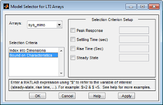 Это окно можно использовать для включения или исключения моделей из массива LTI с использованием различных критериев.