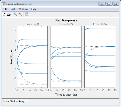Например, если выбрать Вывод (Outputs), пошаговый график реконфигурируется в 3 графика, группируя все выходы вместе на каждом графике. Теперь на каждом графике отображаются отклики одного из входов на все выходы системы MIMO для всех моделей в массиве.