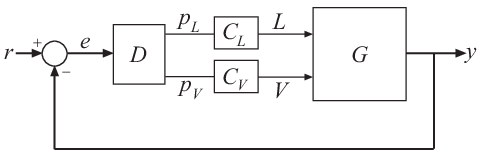 Сигнал векторной уставки r = [r1, r2] определяет требуемые концентрации двух химических веществ. Сигнал векторной ошибки e представляет собой входной сигнал D, статическую матрицу разъединения 2 на 2. CL и CV представляют независимые контроллеры PI, которые управляют двумя входами G .