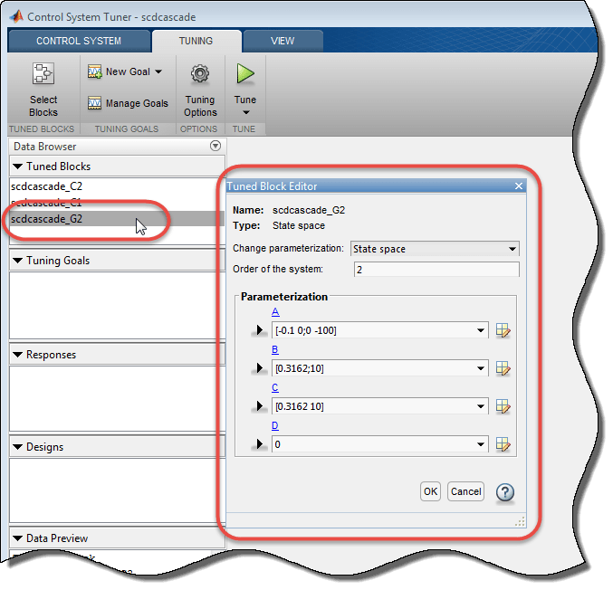 При задании пользовательской параметризации для блока Simulink может оказаться невозможным записать значение настроенного блока обратно в модель Simulink. При записи значений в блоки Simulink модуль настройки системы управления пропускает блоки, которые не могут представлять настроенное значение простым способом и без потерь. Например, при повторной параметризации блока Simulink контроллера PID в качестве модели пространства состояния третьего порядка тюнер системы управления не будет записывать настроенное значение обратно в блок.