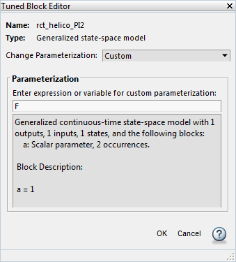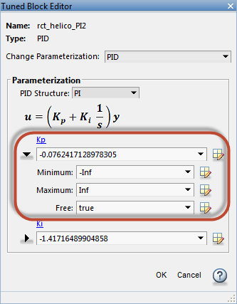В полях редактора настроенных блоков отображается тип параметризации, например: PID, State-Space, или Gain. Для получения более подробной информации о полях нажмите.![]()