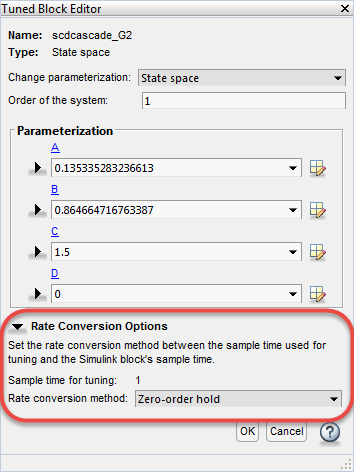 Когда тюнер системы управления записывает настроенные параметры обратно в модель Simulink, каждое значение настроенного блока автоматически преобразуется из времени выборки, используемого для настройки, в время выборки блока Simulink. Если два времени выборки различаются, редактор настроенных блоков содержит дополнительные опции преобразования скорости, которые определяют способ выполнения этой операции повторной выборки для соответствующего блока.