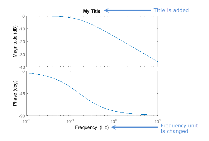 h1 = bodeplot(sys); p1 = getoptions(h1); p1.FreqUnits = 'Hz'; p1.Title.String = 'My Title'; setoptions(h1,p1)