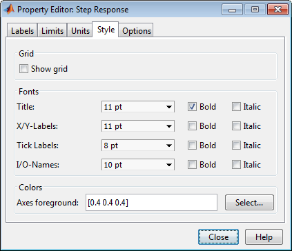 Используйте панель Стиль (Style), чтобы переключить видимость сетки и задать настройки шрифта и цвета переднего плана осей для графиков ответа.