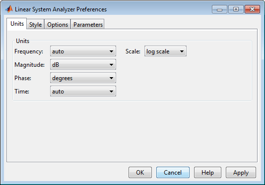 В Linear System Analyzer имеется редактор настроек инструмента, который позволяет задавать характеристики по умолчанию для определенных экземпляров Linear System Analyzer. При открытии нового экземпляра любого из них по умолчанию будут использоваться характеристики, заданные в редакторе настроек панели инструментов.