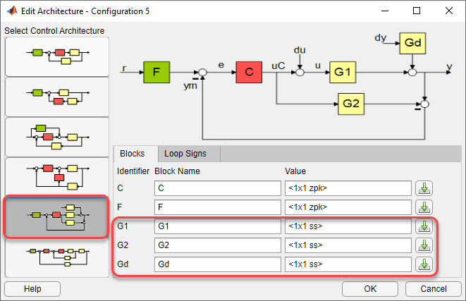 В диалоговом окне Изменить архитектуру (Edit Architecture) выберите пятую архитектуру управления и импортируйте модель завода, G1, прогнозную модель, G2 и модель возмущения Gd.