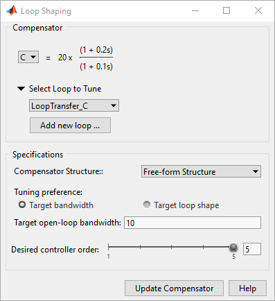 Формирование петель можно использовать для проектирования компенсаторов SISO в конструкторе систем управления для компенсаторов с произвольной или фиксированной конструкцией. Для формирования петель для разработки компенсаторов свободной формы требуется лицензия Rustive Control Toolbox. Формирование контура генерирует стабилизирующий контроллер обратной связи, чтобы как можно ближе соответствовать целевой форме контура. Эту форму цикла можно указать как полосу пропускания или частотную характеристику разомкнутого контура.
