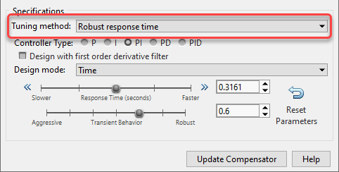 В диалоговом окне «Настройка PID» в разделе «Спецификации» в раскрывающемся списке «Метод настройки» выберите Robust response time.