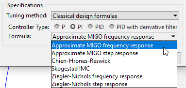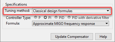 В диалоговом окне «Настройка PID» в разделе «Спецификации» в раскрывающемся списке «Метод настройки» выберите Classical design formulas.