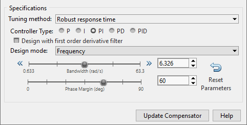 Выберите тип контроллера. При выборе PD или PID установите флажок «Дизайн с производным фильтром первого порядка» для проектирования контроллера PDF или PIDF соответственно.