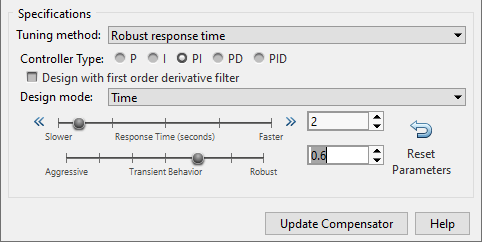 Переходное поведение - укажите переходное поведение контроллера. Вы можете сделать контроллер более агрессивным при отклонении возмущений или более устойчивым к неуверенности завода.
