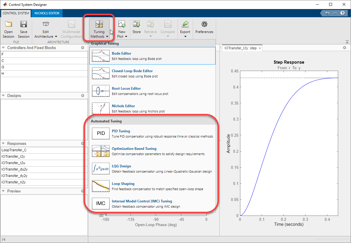 Optimization Based Tuning - Оптимизация параметров компенсатора с использованием проектных требований, реализованных на графиках графической настройки и анализа (требуется программное обеспечение Simulink ® Design Optimization™).