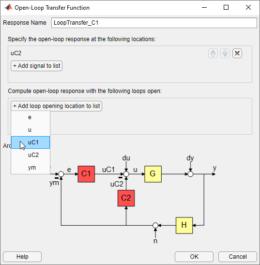 Чтобы добавить размыкание контура на выходе компенсатора внешнего контура, C1 в диалоговом окне Функция передачи разомкнутого контура (Open-Loop Transfer Function) щелкните