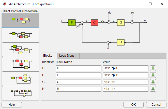 Control System Designer имеет шесть возможных архитектур управления, из которых можно выбрать. Дополнительные сведения об этих архитектурах см. в разделе Архитектуры управления обратной связью.