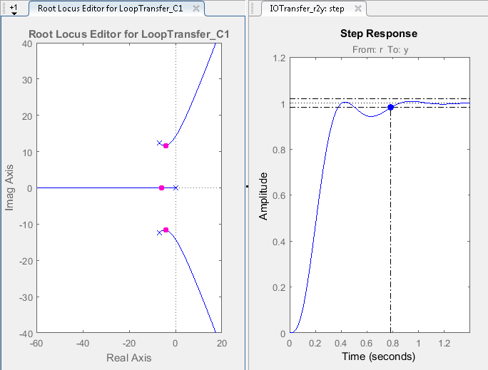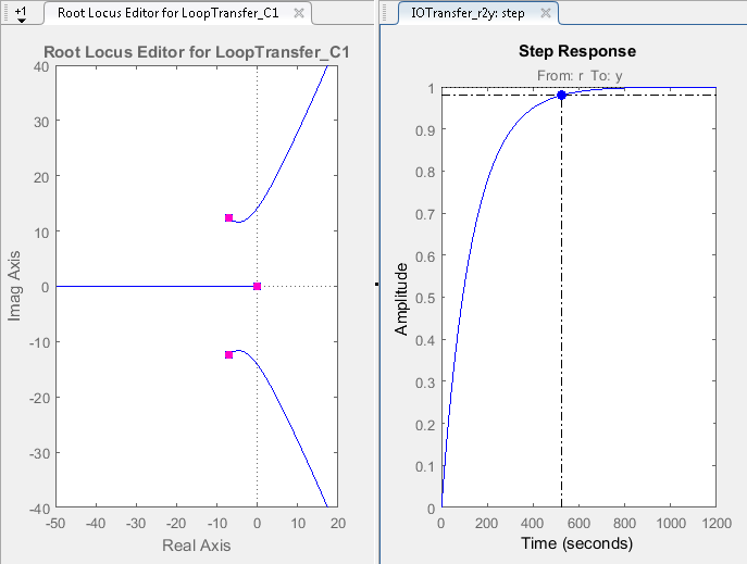 В конструкторе систем управления на вкладке «Вид» выберите «Слева/Справа». Расположите графики так, чтобы они отображали корневой локус для LoopTransfer_C1 и IOTransfer_r2y_step графиков одновременно.